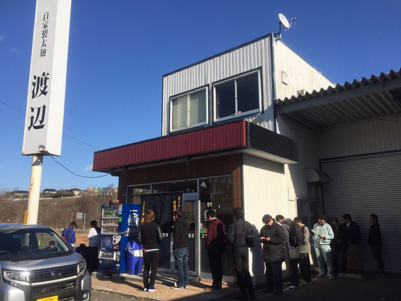 11時30分に到着すると既に店外に20人程の行列。さらに店内にも10人以上が並んでいる。仙台市内から車で30分以上もかかり、どの駅からも歩けない街道筋でこの行列には驚く。期待は膨らみ腹は鳴る。メニューは基本はラーメンの普通と大盛り。大盛りはとんでもない量の麺らしいので普通の食券を購入。40分待った。運ばれてきた渡辺のラーメン。これは凄いラーメンだ。食べたあとも考えた。なぜ凄いのか?